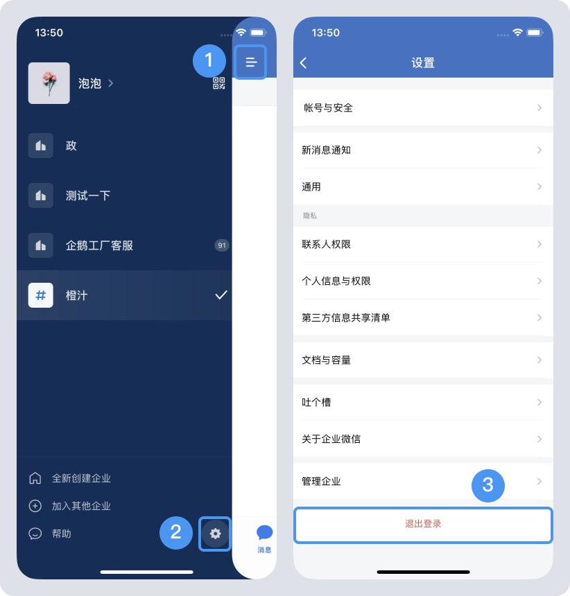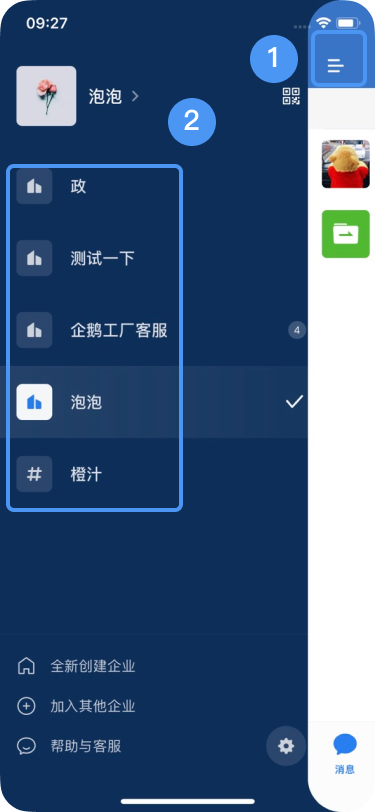 多个企业时,在登录时或者在【手机端->消息页面->左上角“三”】看到多个企业,选择进入对应的企业。