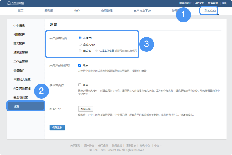 1.企业超级管理员可以到【管理后台->我的企业->设置】内设置客户端启动页,可以选择不使用启动页、使用企业LOGO或者自定义页做为客户端启动页;