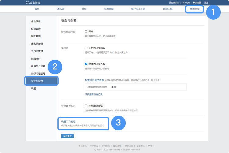 管理员支持在【管理后台->我的企业->安全与保密->设置二次验证】中设置二次验证。设置后成员在管理员首次设置了二次验证后进入企业会进入二次验证页面(通过微信授权登录、手机号登录等方式进入到设置了二次验证的企业均需要进行验证)。