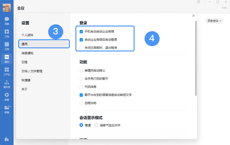 电脑端【左上角头像->设置->通用->登录】中可选择开机自动启动企业微信、启动企业微信后自动登录、关闭主面板时自动退出程序,取消勾选即关闭这些功能。