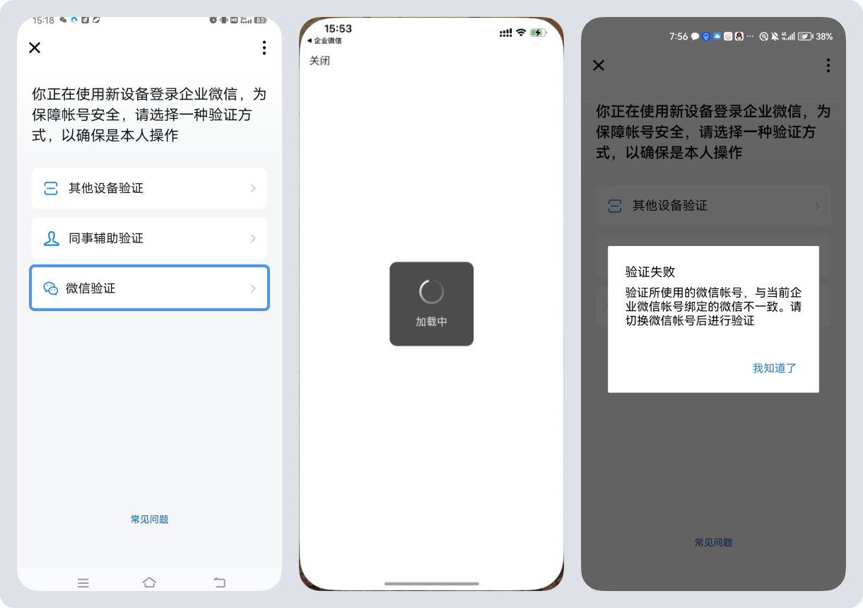 若同设备登录的微信与企业微信绑定的微信号不一致时,会提示“验证失败 验证所使用的微信帐号,与当前企业微信帐号所绑定的微信不一致。请切换微信帐号后进行验证”。
