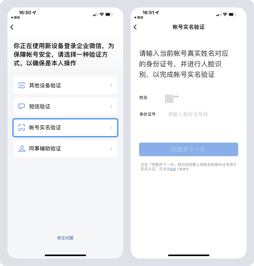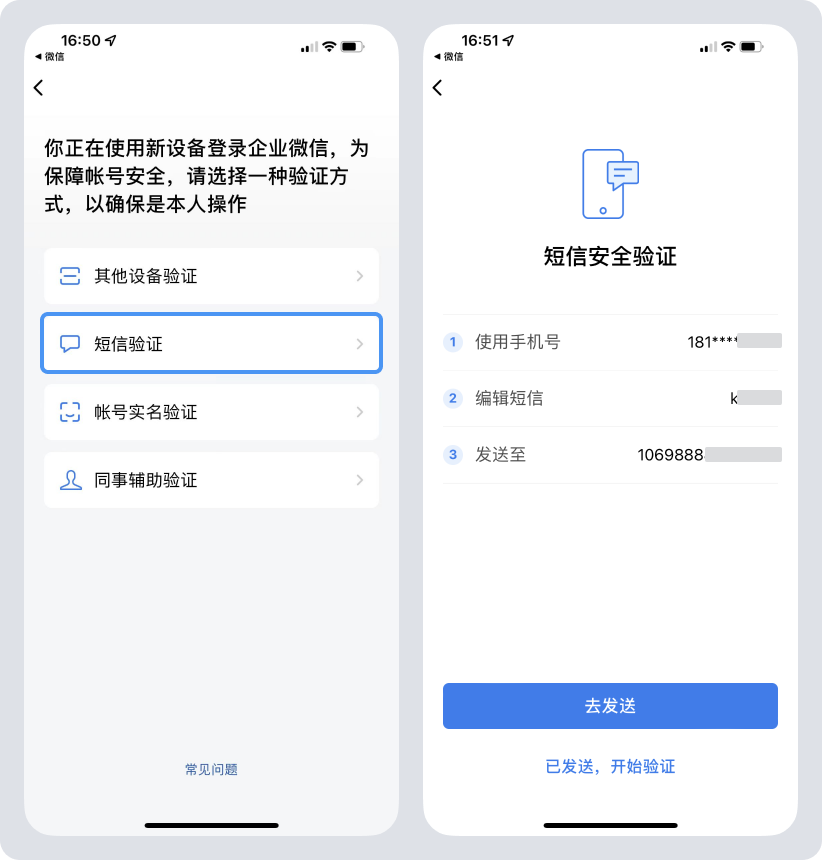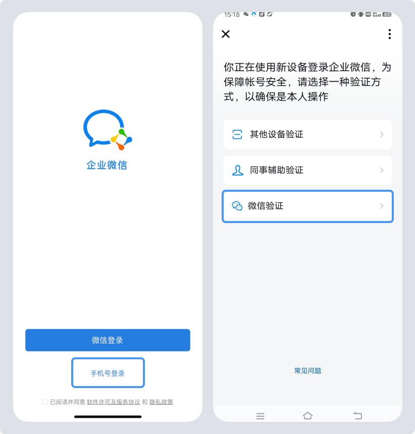 登录方式为手机号登录,且手机号名下对应企业微信有绑定微信时,会出现微信验证。需同设备登录的微信号与企业微信绑定的微信号一致。