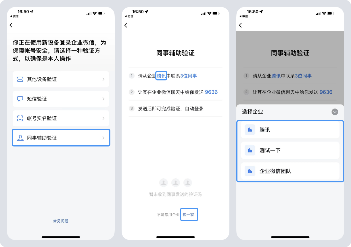 点击同事辅助验证,页面会显示成员目前所在的其中任意企业名称以及验证码,需从该企业中联系3位同事,让其在的企业微信聊天会话中发送验证码,发送完成后即可完成新设备登录验证。