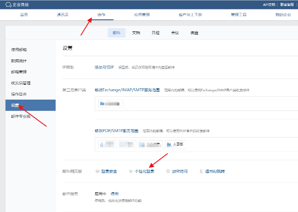 1、功能入口: 管理员登录后,在企业微信管理后台—协作—设置—个性化登录: