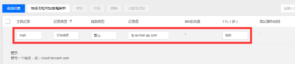(2)已完成备案的域名,需要登录域名后台设置CNAME记录,然后主机记录填写mail、记录类型选择CNAME、记录值填写tp.exmail.qq.com,其它保持默认。