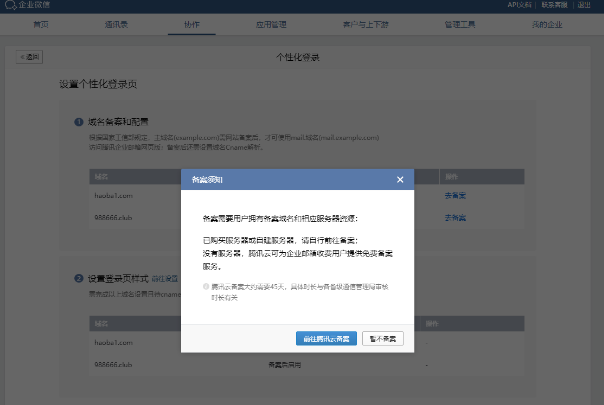 设置“个性化登录页面”需要域名备案,客户在设置mail.自定义登录页之前,需要先对域名做备案,备案通过后才可以设置自定义登录页。