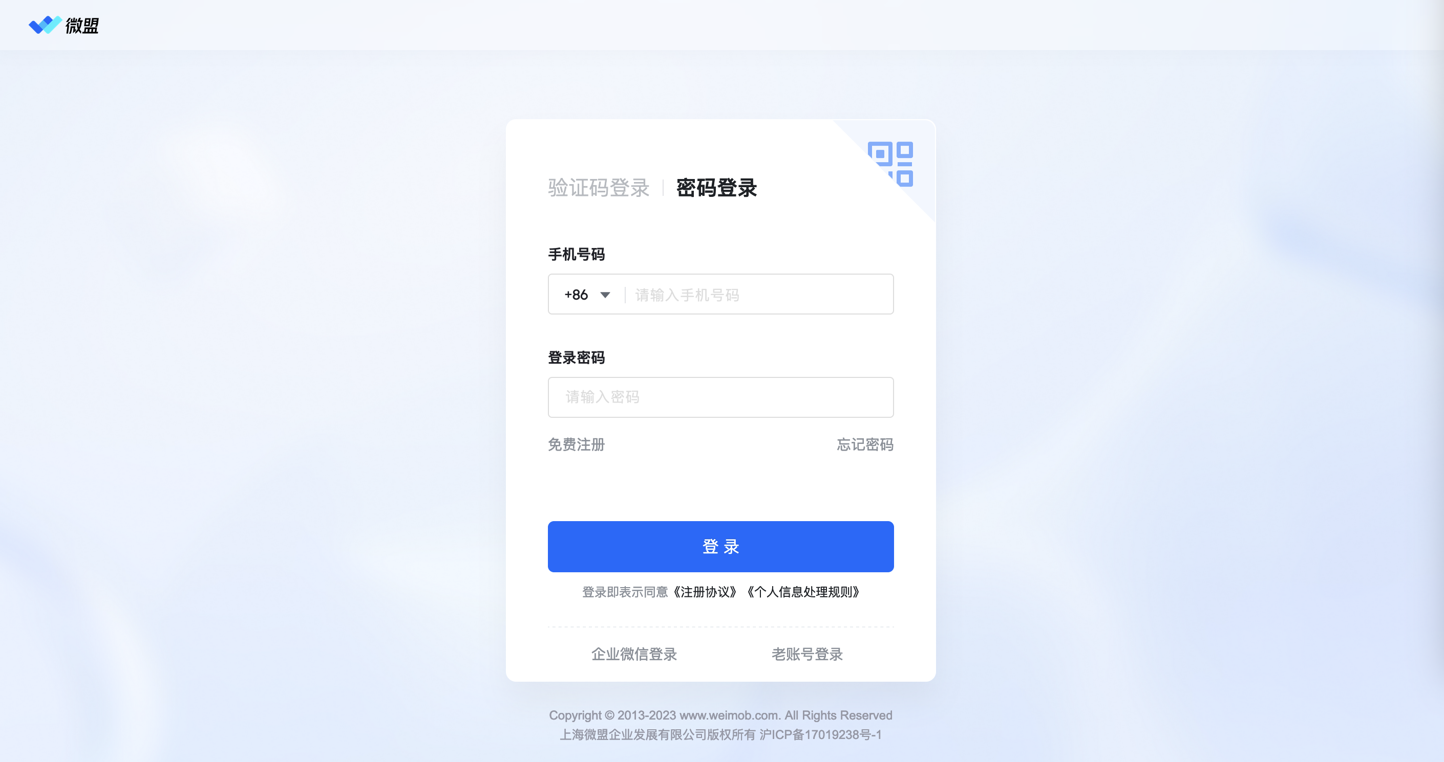 从微盟官网www.weimob.com右上角的登录或免费试用入口进入登录、注册页面,输入所需信息完成账号登录或注册。