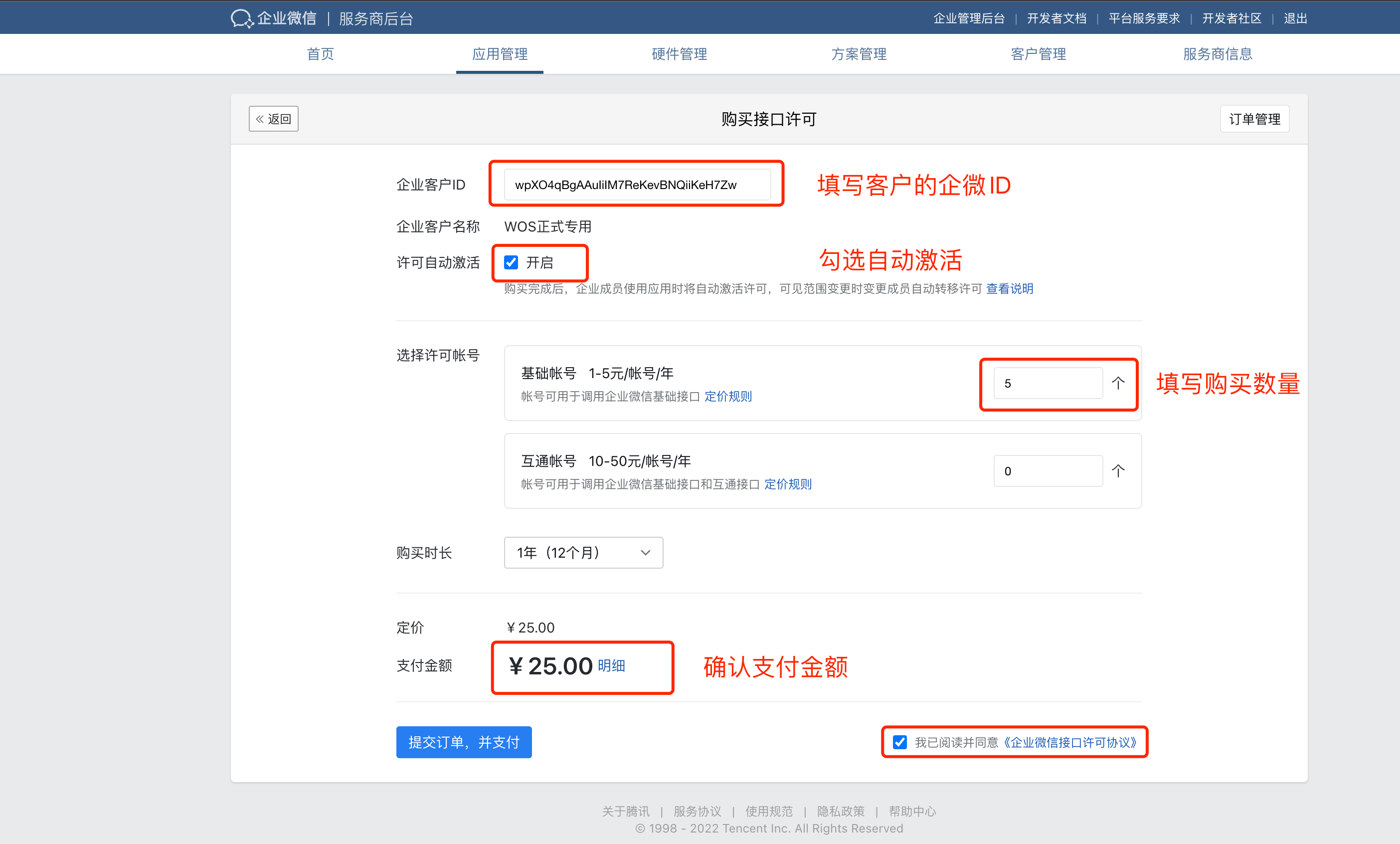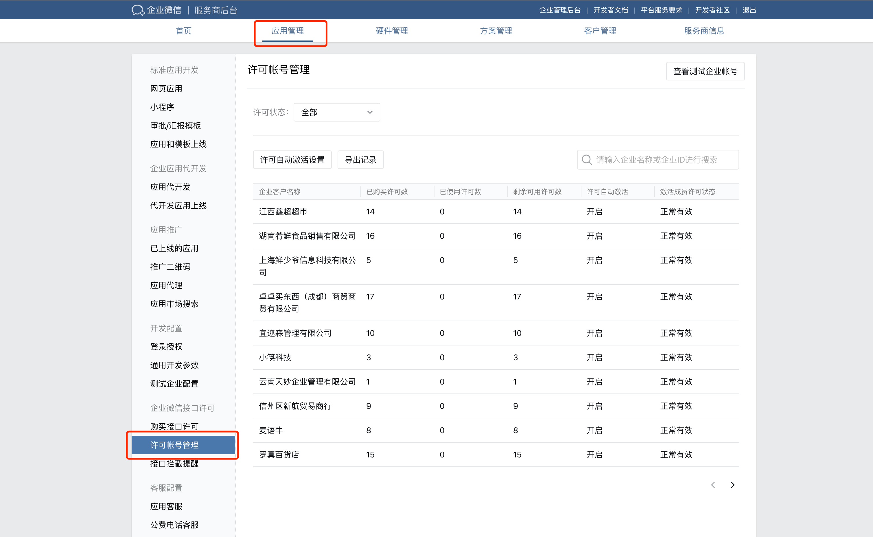 2.在客户没有指定开通人员的情况下,请务必勾选上方「许可自动激活-开启」的开关。若未勾选,依然会导致客户被企微拦截。