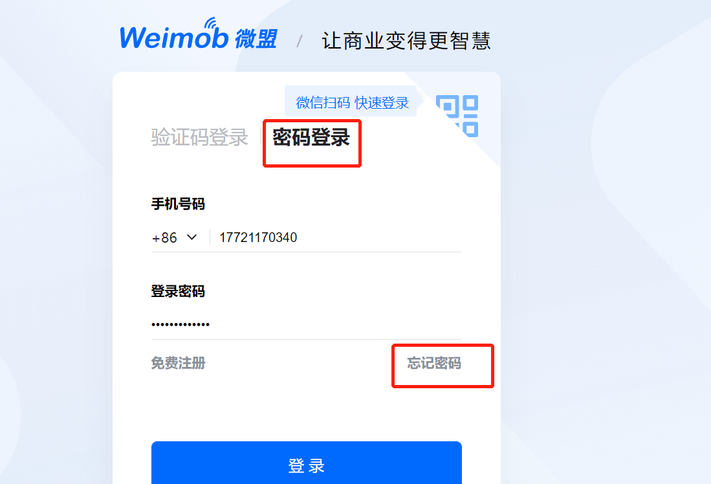 登录https://master.weimob.com网址,在登录界面点忘记密码,使用手机号获取验证码重新设置密码,设置成功再次登录即可