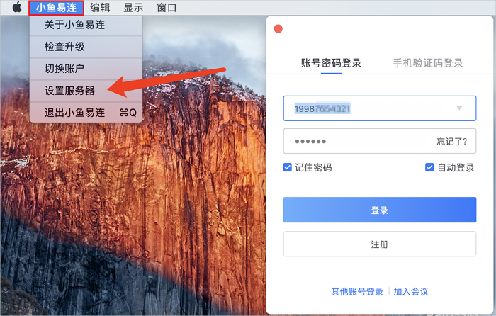 登录PC/Mac客户端时,如何修改服务器地址?更新时间:2022-06-09 • PC客户端 在PC客户端登录界面,点击右上角 按钮,选择设置服务器,修改服务器地址。 • Mac客户端 点击Mac屏幕上方的小鱼易连菜单栏,选择设置服务器,修改服务器地址。
