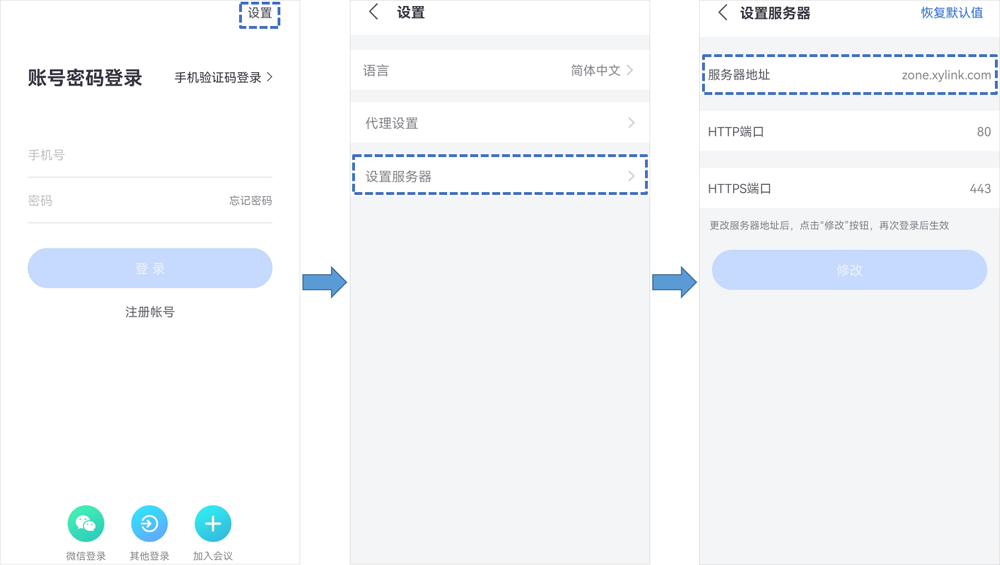登录小鱼易连App时,如何修改服务器地址?更新时间:2022-07-05 在小鱼易连App登录界面,点击右上角设置按钮,设置指定服务器地址。