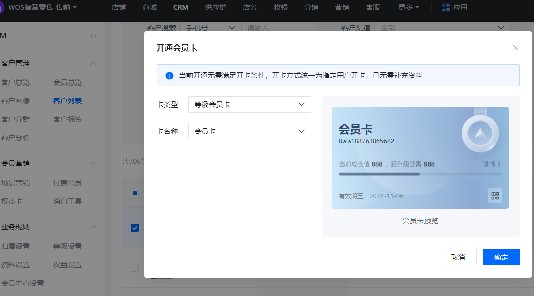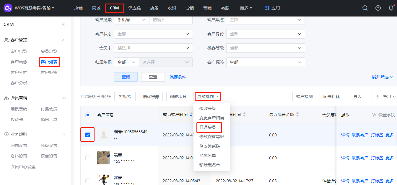 步骤:品牌(总部后台) → CRM → 客户管理 → 客户列表 → 勾选对应的客户,更多里面,选择“开通会员”,选择对应的会员卡即可